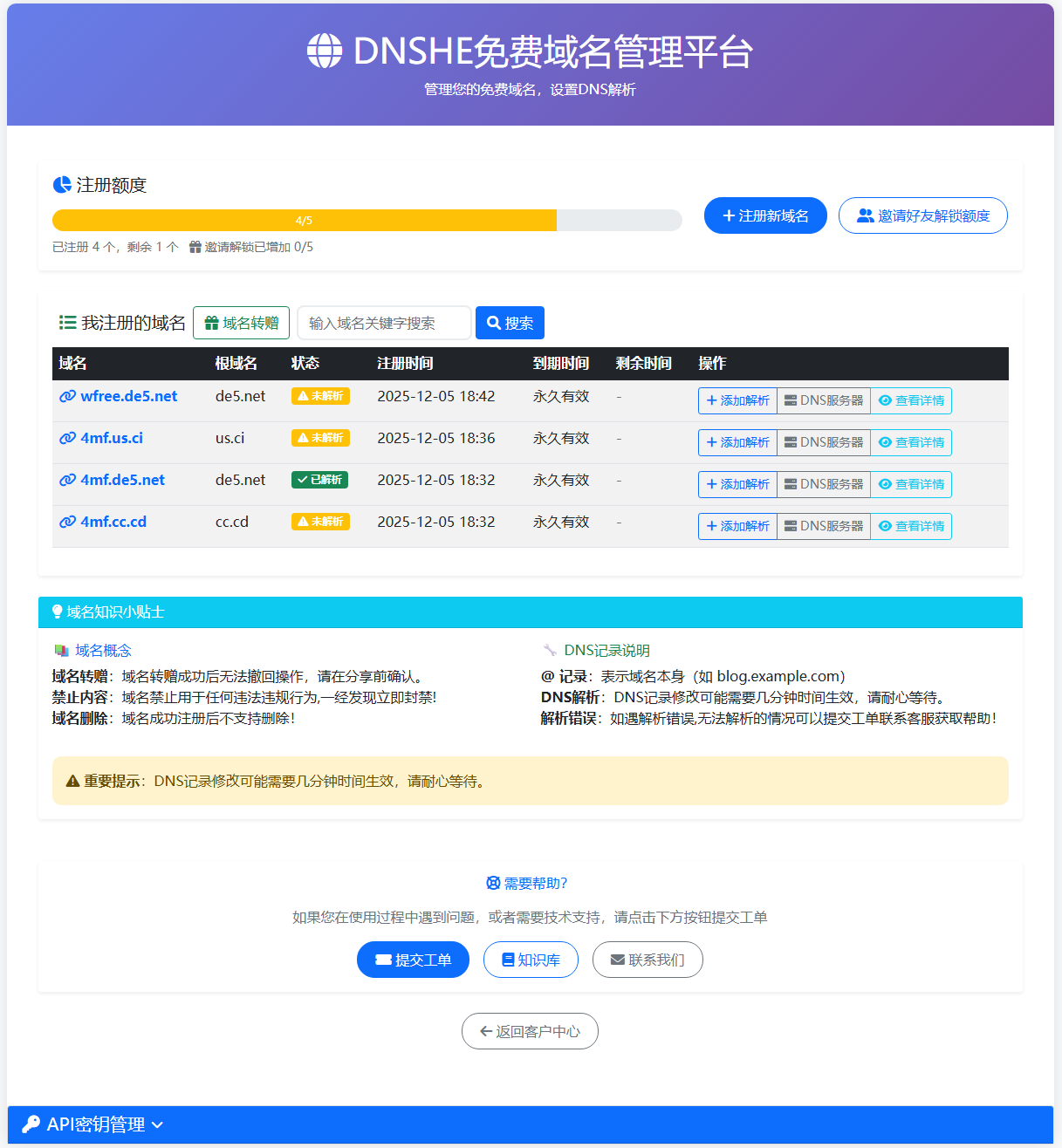 DNSHE是一个非营利性的域名分发平台,由DNSHE团队驱动。我们的愿景是降低互联网内容的创作门槛。