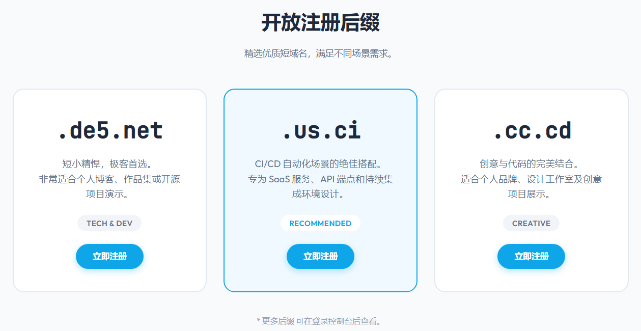 域名后缀.de5.net/.us.ci/.cc.cd,其中.de5.net后缀支持添加CloudFlare绑定管理。