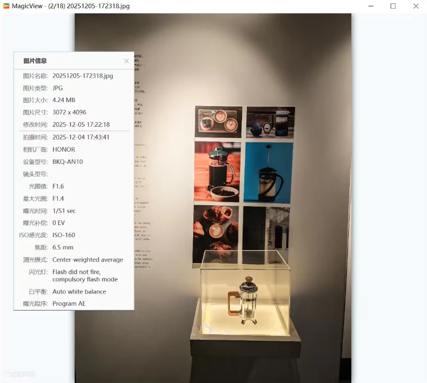 - 查看图片时,按 Tab 键可查看 EXIF 信息,鼠标滚轮可切换图片或缩放画面