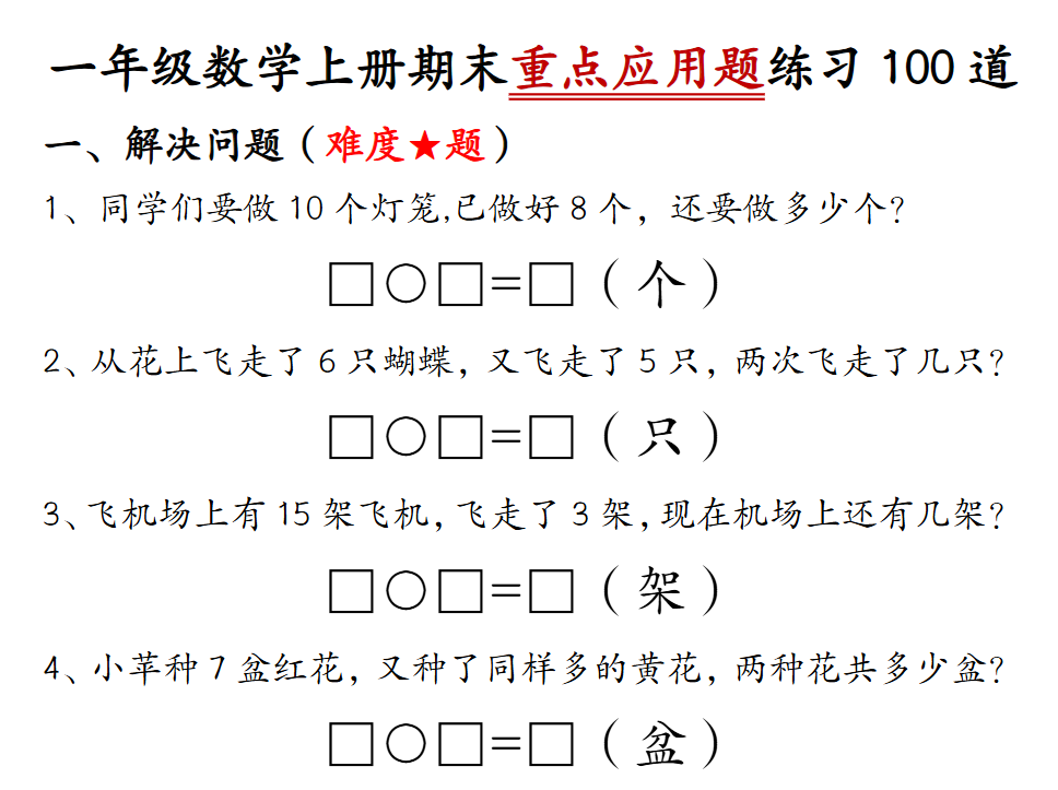 | 1 | 一年级 上册 数学期末全册应用题专项.pdf | 369.1KB | 2026-01-13 20:32 | 小学 1 年级(上册) | 20 以内加减法应用题、图文结合应用题、排队问题、分类计数问题等基础应用 |