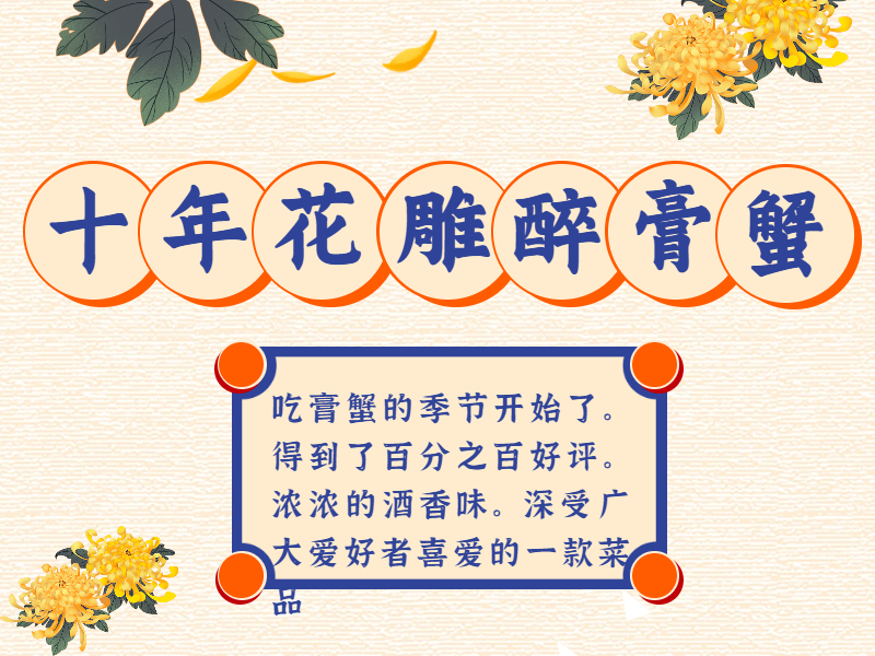 | 1 | 十年花雕醉膏蟹 | ¥59.80 | 海鲜醉卤菜 | 蟹的鲜活处理 + 醉卤汁配比 + 冷藏入味时间把控 |