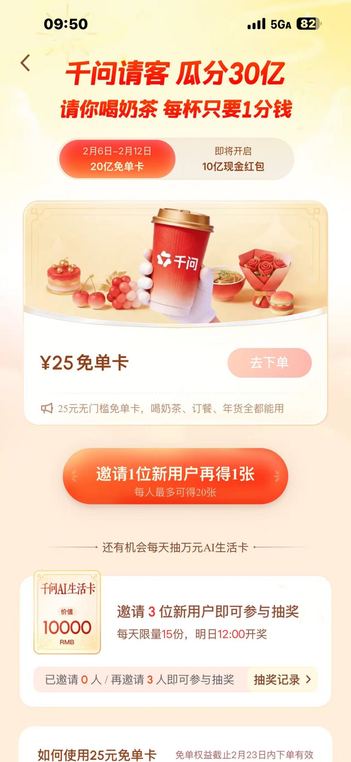 登录千问APP就有25元免单卡,邀请1位新用户再得一张。邀请3人还可抽奖10000元千问AI生活卡抽奖。
