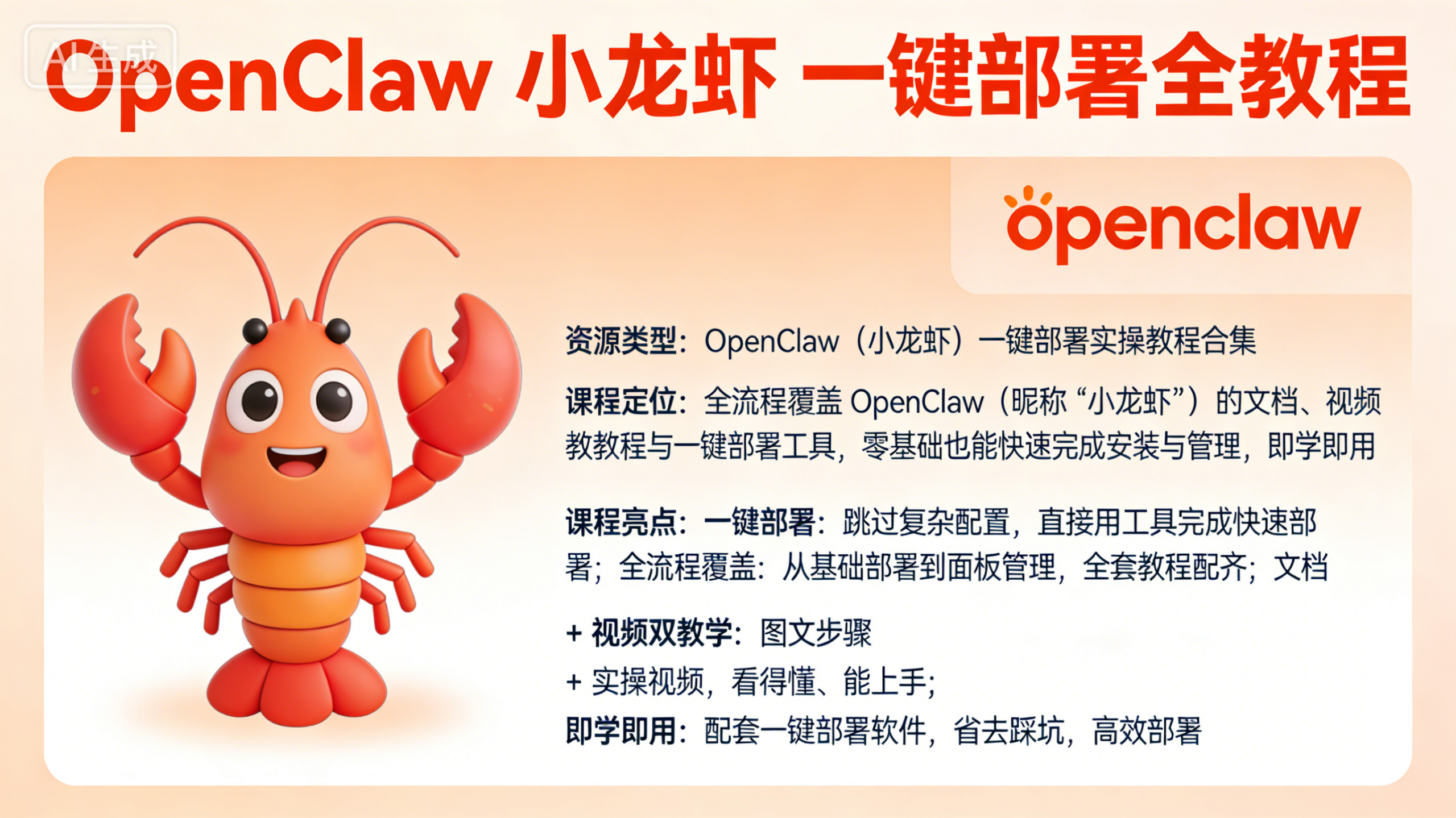 课程定位:全流程覆盖 OpenClaw(昵称 “小龙虾”)的文档、视频教程与一键部署工具,零基础也能快速完成安装与管理,即学即用。