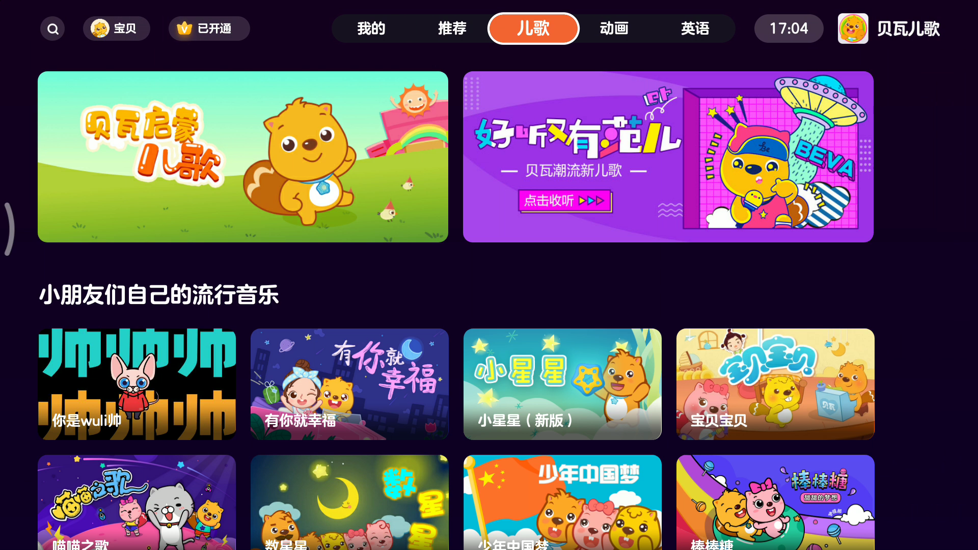 贝瓦儿歌,v7.7.3, TV 版 v4.1.2, 儿童早教,儿歌动画,解锁会员,免登录,去广告,安卓 TV, 儿童教育 APP