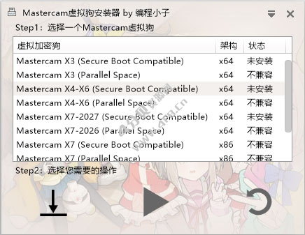 - 3、根据您的Mastercam版本,选择对应的虚拟狗版本,然后在下方根据需要选择“安装/卸载”、“启用/停用”或“重启”。